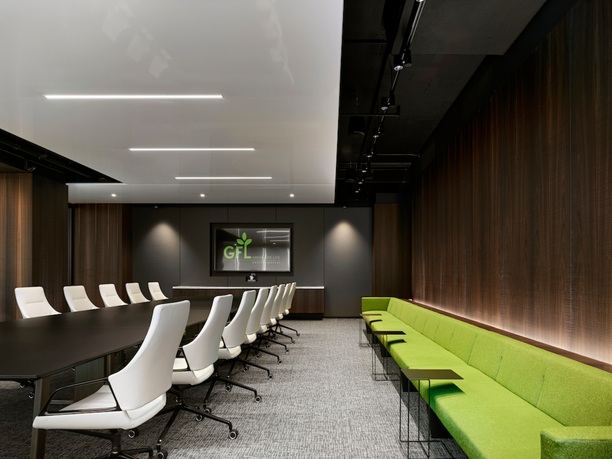 The Canadian waste management company GFL Environmental (“Green for Life”) in Toronto pursues the holistic goal of strengthening environmental responsibility in the population. Accordingly, Gensler Architects chose an interior for the new GFL headquarters that relies on high-quality materials and natural colors, combined with the bold green of the company's color scheme. The representative entrance areas, lobbies and conference rooms are clad with high-quality American walnut wood, which creates an appealing contrast to the light-colored upholstered chairs.